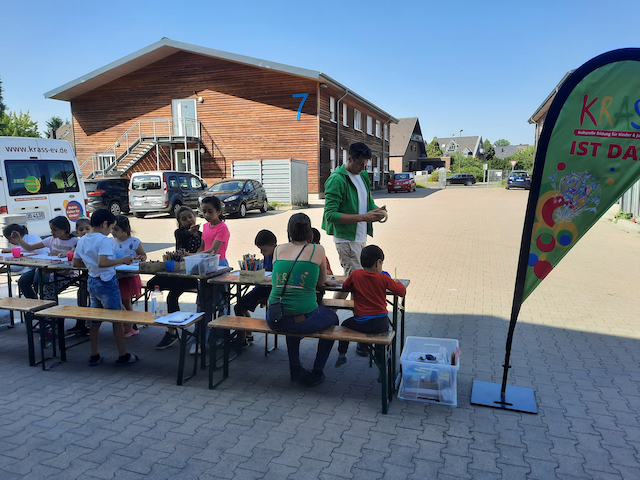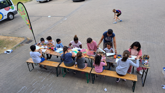 Das Team brachte Farben, Papier, Bastelmaterialien und viele kreative Ideen mit. In den Unterkünften entstand so regelmäßig ein geschützter Raum, in dem die Kinder malen, basteln, gestalten und sich ausdrücken konnten. Durch dieses kreative Angebot erhielten sie nicht nur eine wertvolle Auszeit vom oft schwierigen Alltag, sondern auch die Möglichkeit, spielerisch Deutsch zu lernen. Der niedrigschwellige Sprachunterricht erfolgte dabei ganz praktisch – beim Malen, Basteln und gemeinsamen Erzählen.